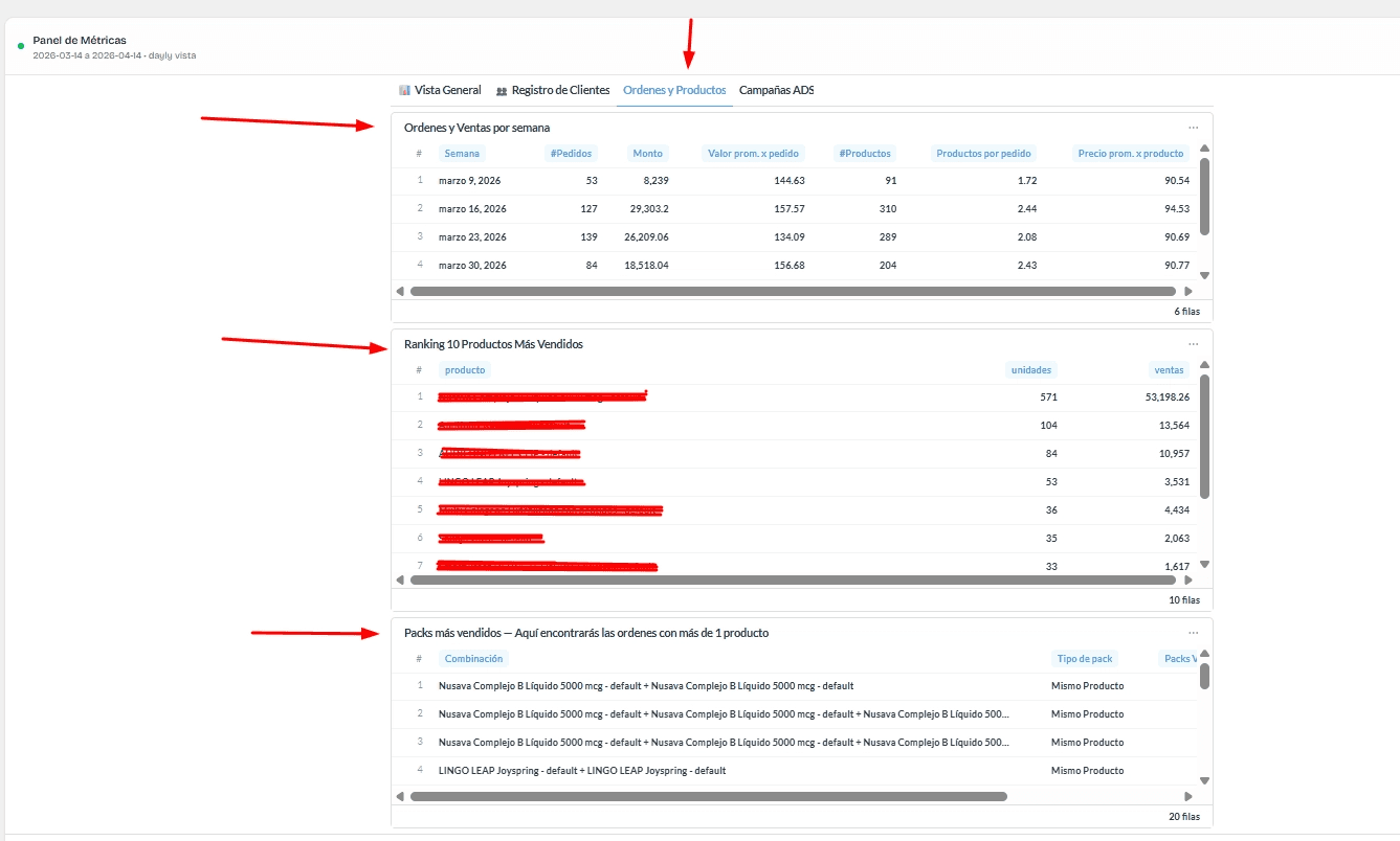 En esta vista puedes medir por semana el número de órdenes, ventas en S/, ticket promedio y la cantidad de productos por orden.