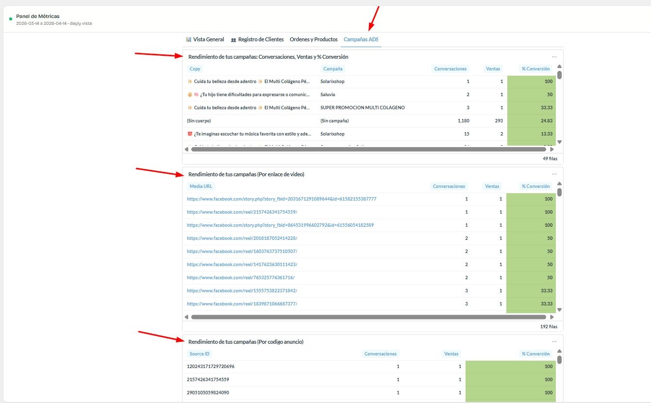 En esta vista puedes medir el rendimiento de tus anuncios con mayor detalle. Puedes ver el número de conversaciones, ventas y porcentaje de conversión por nombre de campaña.